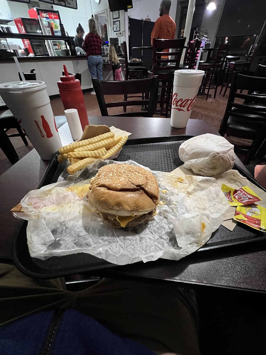 Good hole in the wall spot for food in an area with not a lot of options! We came through and got burgers, a corn dog, fries, and a chef salad. Made fresh and hot, dining area was dark, but no major complaints. There’s also several options not on the menu listed- patty melt and chicken nuggets/ strips.
